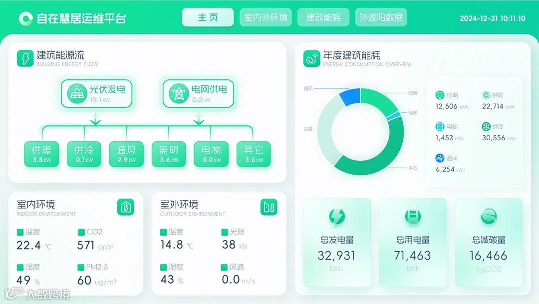 金星宇超低能耗办公楼已正式运行一年多,根据自主开发的能源监测运维平台数据显示,该办公楼通过多项节能技术,将全年室内办公环境稳定维持在温度21-26℃、湿度40%-60%、二氧化碳浓度600ppm以下,为员工提供了舒适、健康的工作环境,显著增强了员工的工作效率与幸福感。整栋楼的节能降碳效果全面优于设计指标,在降低能源消耗的同时,提升了环境品质。