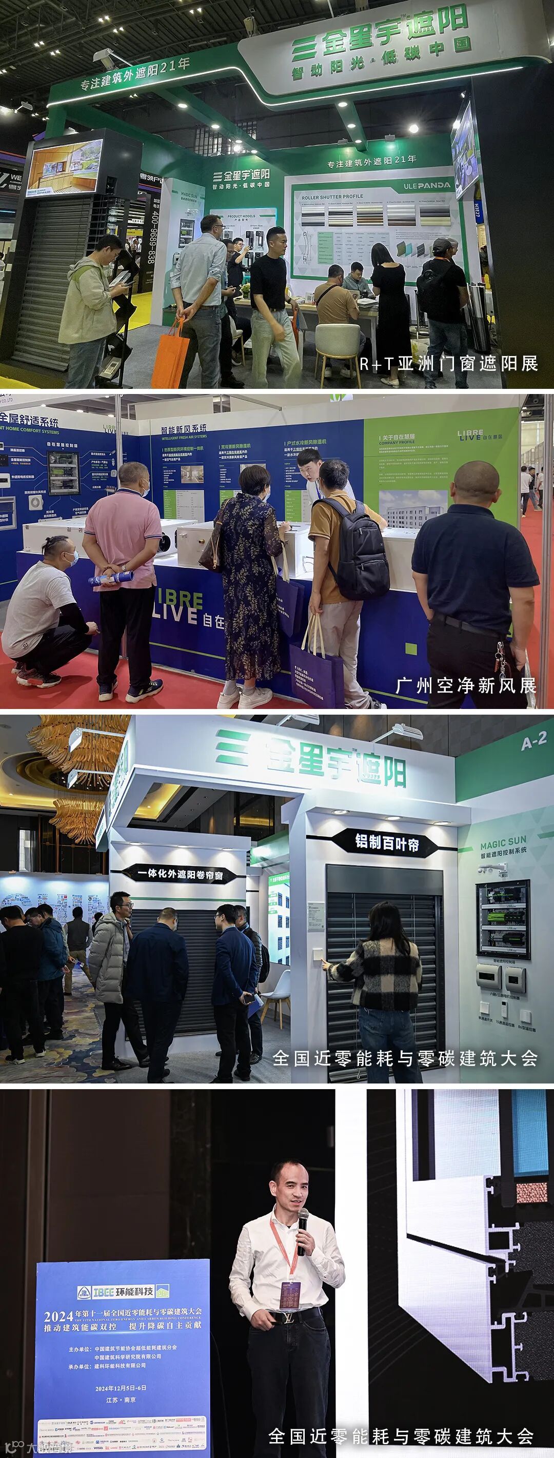 2024年,金星宇遮阳携建筑遮阳解决方案及全屋智能舒适系统先后亮相了R+T亚洲门窗遮阳展、广州空净新风展、全国近零能耗与零碳建筑大会,向现场人员展现了金星宇遮阳深耕行业二十一载的强大产品和技术实力。与此同时,金星宇遮阳受邀参与多场行业专业论坛活动,在活动中分享了其超低能耗办公楼的探索实践经验,以及建筑外遮阳的设计与应用成果。通过这些专业平台,与行业同仁携手,共同为绿色建筑的发展贡献力量。