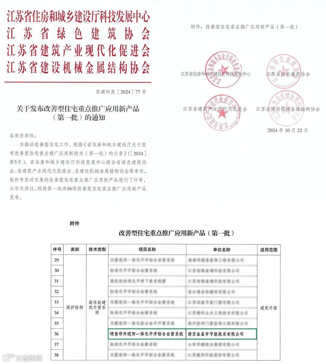 江苏省住房和城乡建设厅科技发展中心、江苏省绿色建筑协会、江苏省建筑产业现代化促进会、江苏省建设机械金属结构协会联合开展了改善型住宅重点推广应用新产品的征集工作。经过严格评审,首批56项重点推广应用新产品正式发布。其中,金星宇遮阳自主研发的硬卷帘外遮阳一体化平开铝合金窗系统(简称“一体化外遮阳卷帘窗”)成功上榜,展现出行业领先的技术实力与应用价值。