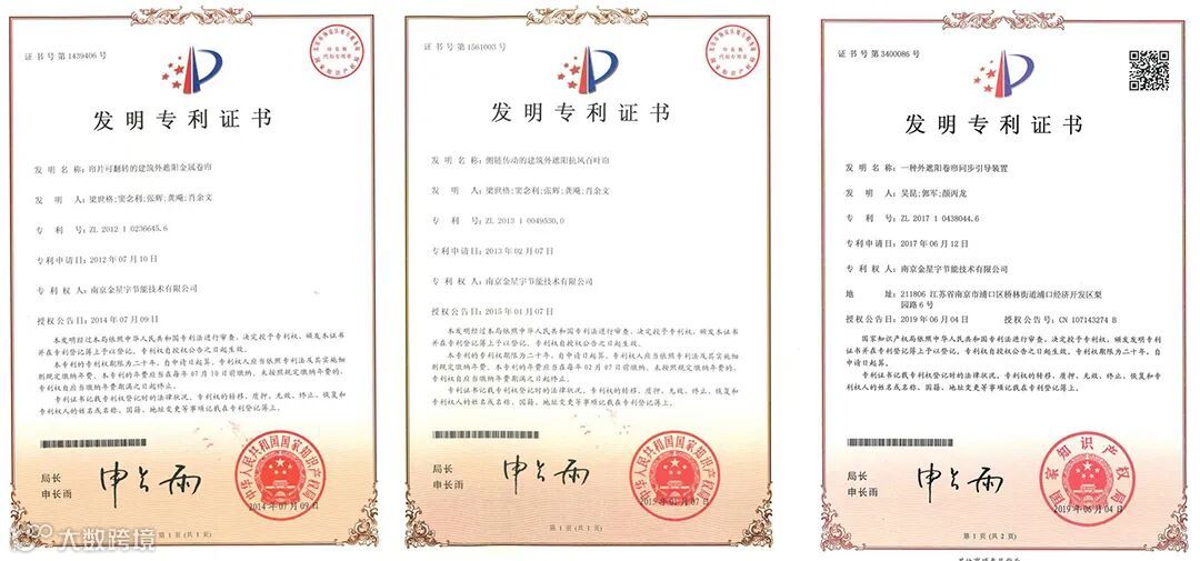 截至目前,金星宇遮阳凭借其雄厚的人才储备和先进的设备优势,已在外遮阳行业取得了显著的技术成果,成功拥有自主知识产权100余项,涵盖了专利授权、商标注册、软件著作权登记等多个领域。这些自主知识产权不仅体现了公司强大的创新能力和技术研发实力,也展示了金星宇遮阳在外遮阳行业中的领导地位。