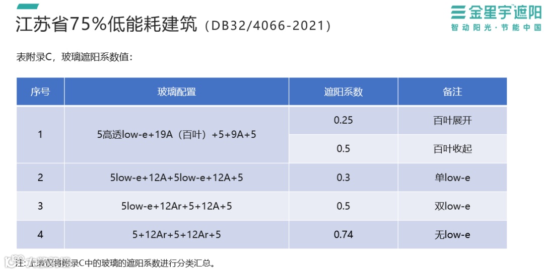 由表5.2.6-3可见,这类建筑仅对夏季遮阳系数有要求,而对冬季遮阳系数无要求,似乎是各种遮阳(外遮阳、内置、low-e)都可以,只要满足标准要求的夏季遮阳系数即可;