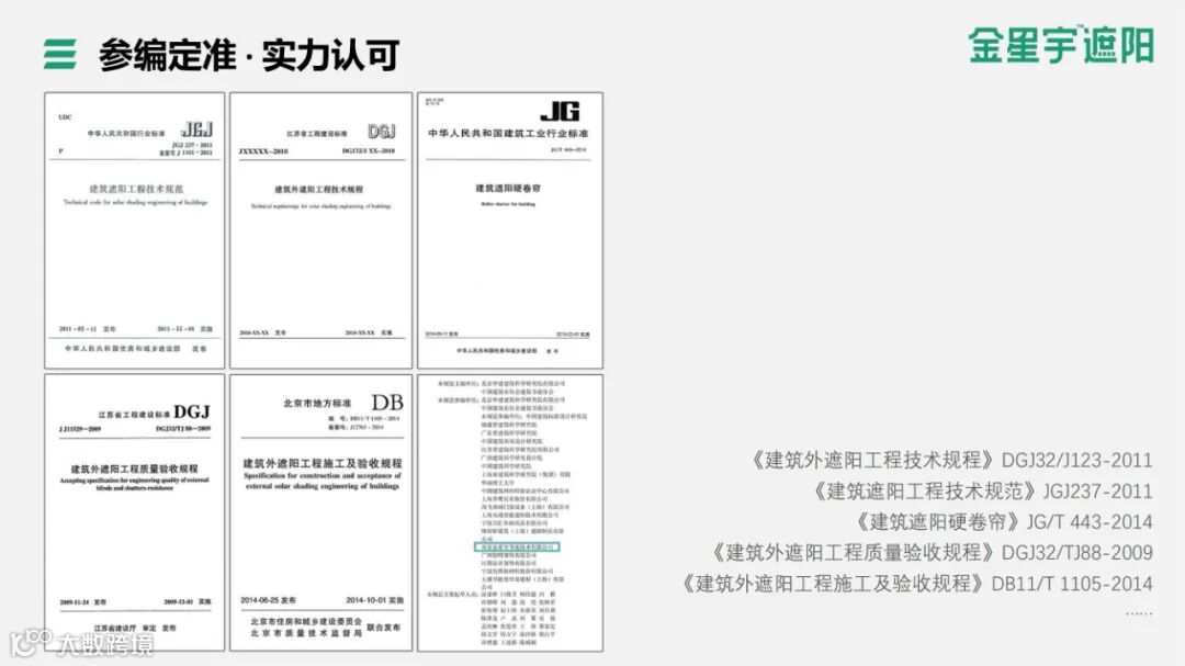 多年来,金星宇积极参与行业标准的制定工作,先后应邀参编《建筑外遮阳工程技术规范》JGJ237-2011、《建筑遮阳硬卷帘》JG/T443-2014等五项行业标准,将外遮阳的技术内涵及应用推广到国内绿色建筑之中。2010年,金星宇获得江苏省建设科技推广项目;2013年,新生产基地落成,获评成为“中国建筑遮阳十大知名品牌”;2019年,产能突破超100万平米;2020年,铝制百叶帘全系列量产;2021年,筹建近零能耗建筑工程技术研发中心,并获CABEE“超低能耗建筑”认证;2022年,战略合作德国LOXONE智能家居系统。