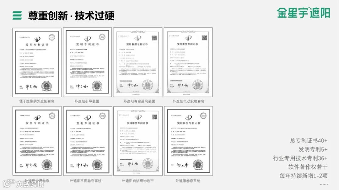 同时,与欧洲遮阳组织长期保持频繁的技术交流合作,不断扩展产品技术研究的边界。凭借多年的行业专注力,金星宇取得了多项发明专利,得到国家及行业的认可,将中国的建筑遮阳带入了新的时代。