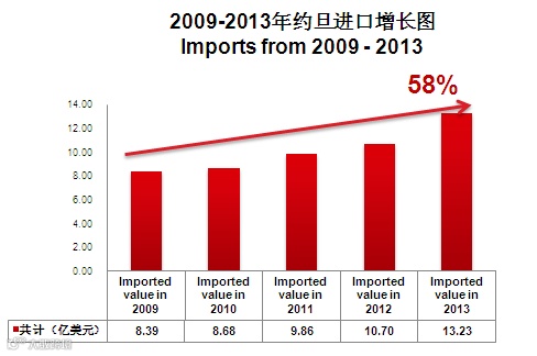 2013年约旦纺织服装品总进口约为13.23亿美元 ,其中 面料辅料8.22亿美元,占62%;服装(成衣)为3.90亿美元,占30%;家纺产品1.11亿美元,占8%。 2009–2013年,5年间约旦纺织服装产品进口增长了58%。