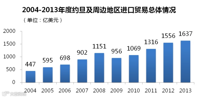 2013年,区域总进口额为1637亿美元,其中自中国进口的产品总值达209亿美元。