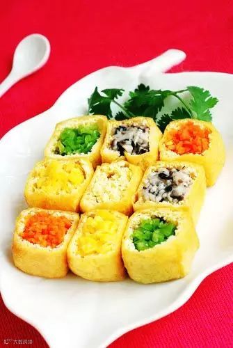 4、将肉馅添到豆腐盒子的底层,不要添满,肉馅上面分别添入其它的几种蔬菜,摆入盘中。