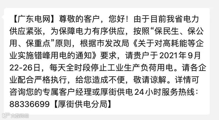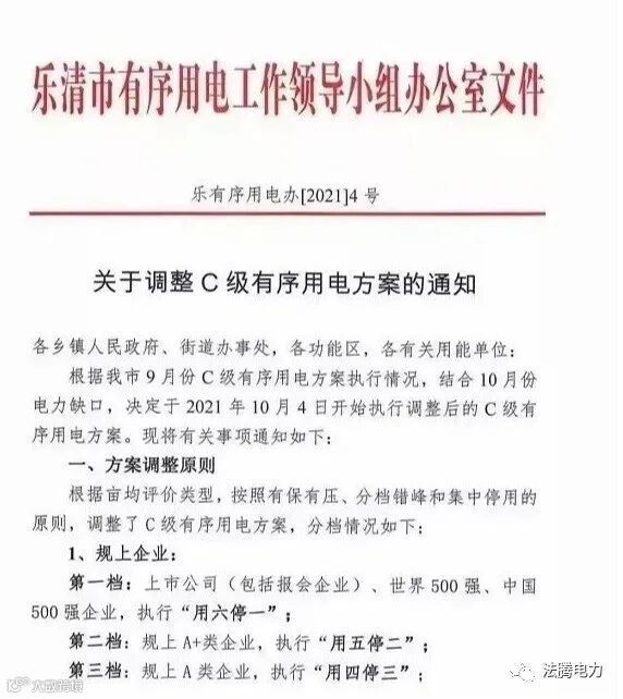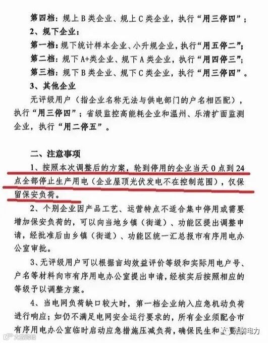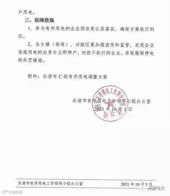 此外,10月3日,浙江省乐清市有序用电工作领导小组办公室文件印发有序用电办[2021]4号《关于调整C级有序用电方案的通知》,文件中明确:轮到停用的企业当天0点到24点全部停止生产用电,但是企业屋顶光伏发电不在控制范围!