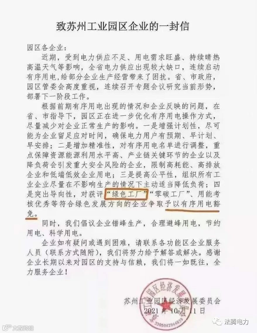 10月11日,苏州工业园区发文,受到电力供应不足、用电需求旺盛等影响,全省电力供应出现较大缺口,将进一步优化有序用电操作方式,限制高能耗、高排放企业用电,对获评:“绿色工厂”“零碳工厂”、用能考核优秀等符合绿色发展方向的企业争取予以有序用电豁免。