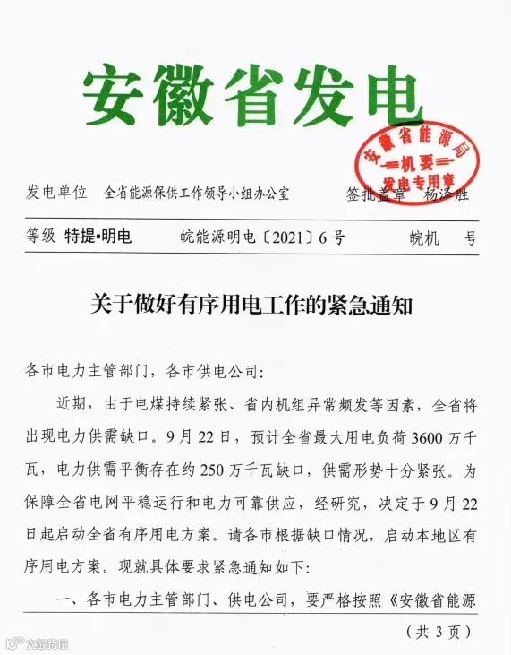 9月22日,安徽全省能源保供工作领导小组办公室也发布了《关于做好有序用电的紧急通知》。