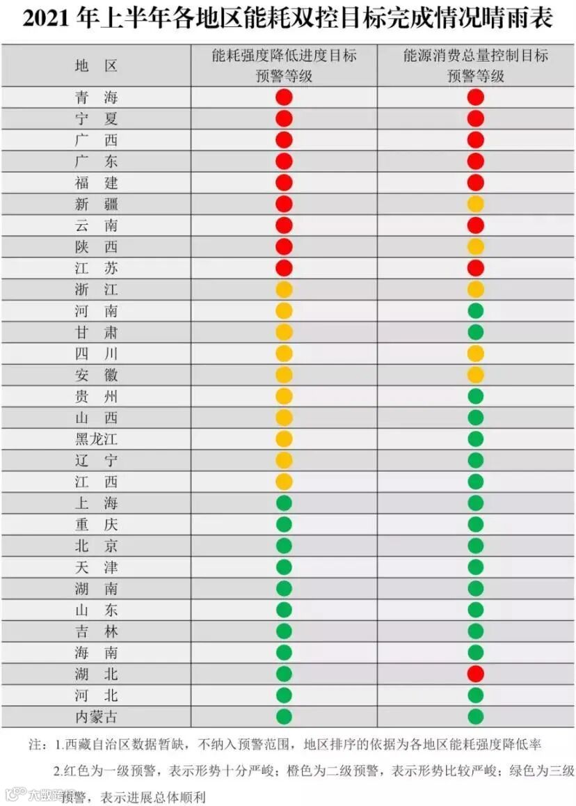 8月17日,国家发改委印发了《2021年上半年各地区能耗双控目标完成情况晴雨表》,从能耗强度降低情况看,今年上半年,青海、宁夏、广西、广东、福建、新疆、云南、陕西、江苏9个省(区)能耗强度同比不降反升,10个省份能耗强度降低率未达到进度要求,全国节能形势十分严峻。各地针对能耗管控的力度也在不断加大,陆续出台限电、有序用电政策。