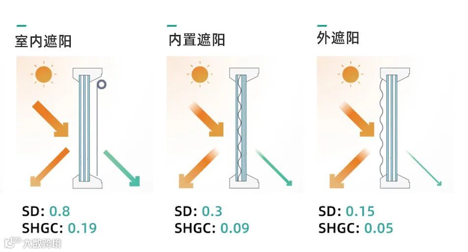 业内普遍认同,从遮阳效果来看,外遮阳(安装在建筑物透明外围护结构外侧的遮阳装置)的节能效果远优于内置遮阳(安装在中空玻璃内的遮阳装置)和室内遮阳(安装在建筑物透明外围护结构内侧的遮光装置)。
