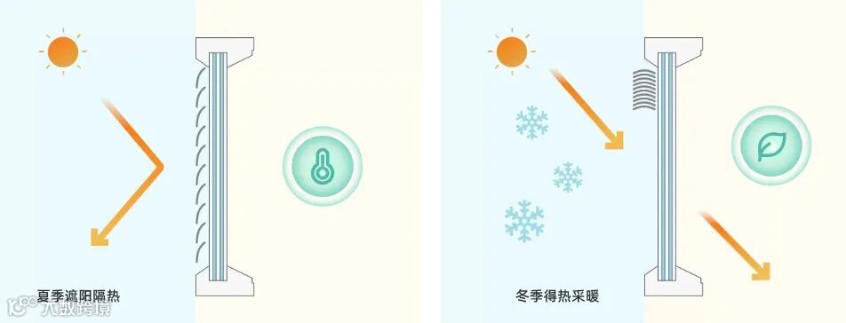 当遮阳设施完全关闭时,外遮阳设备在玻璃外侧就能阻隔60%到80%的阳光热辐射,只有少量散射光热会作用于玻璃,因此能最大幅度降低太阳得热,从源头控制室内升温趋势。
