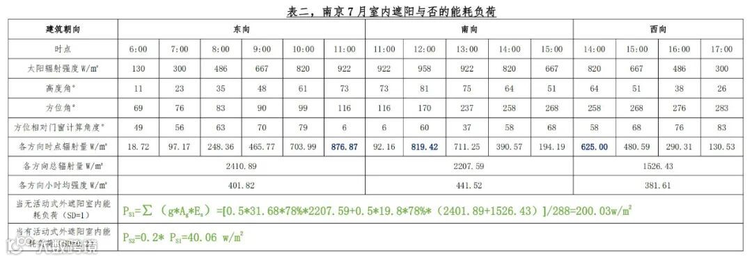 由表二可见:7月的该建筑各朝向的日照时长和辐射强度明显高于1月的情况;且,东向在11:00左右辐射强度到达最高点,南向开始出现太阳辐射,南向在12:00左右到达最高点,在15:00左右南向出现最低辐射强度,辐射强度转向西向,并在该时点出现辐射强度峰值,以后逐步降低;整个白天的太阳辐射将对室内的光热环境影响非常明显,利用活动式外遮阳来进行遮挡以有效降低太阳得热的室内影响是最为有效的措施和手段;该建筑东南西三朝向的7月太阳辐射总量基本接近,这也是为何南京的东/西晒特别令人难受的数据依据;同时看来,该建筑东、南、西三朝向设置活动式外遮阳是必要的;西向的辐射总量实际还会比1526.43W/㎡大些,因为17:00-19:00的太阳辐射客观还是存在的。