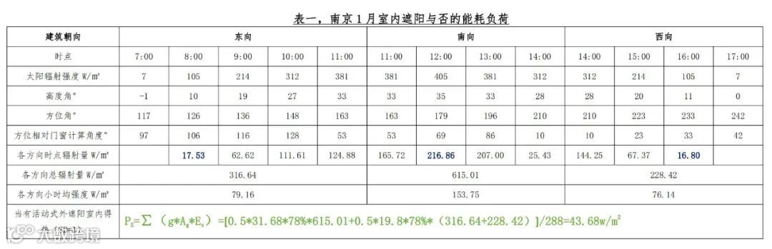 例:南京,独栋建筑,建筑朝向为西偏北20°,周边无其他遮挡,室内处理后楼面面积288m²,南向外门窗共31.68m²(Qc约为:0.4);东西向外窗各为19.8㎡(Qc约为:0.25);玻璃占比为78%,玻璃g值为0.5,门窗的SD值为0.2;以1月和7月为代表的太阳辐射在建筑遮阳与否室内能耗情况,如下表:表一,南京1月室内遮阳与否的能耗负荷;表二,南京7月室内遮阳与否的能耗负荷。