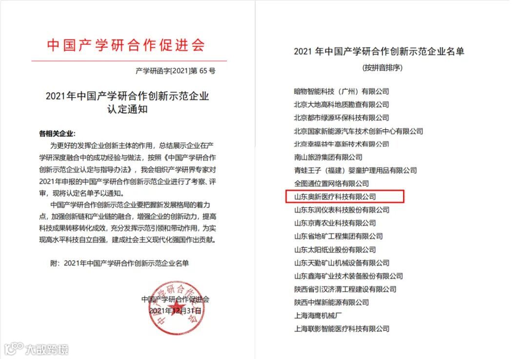 科技创新是企业发展的根本动力,奥新医疗在产品研发过程中,一直积极与中科院电工所、北医三院、山大齐鲁医院、潍医附院、滨州医学院等科研院所、医疗机构开展行业前沿技术的交流与合作,同时也通过各类行业协会及时、准确的了解国内外行业政策及信息。其中,中国产学研合作促进会作为我司合作单位,是经国务院批准,由国家发改委、科技部、工信部及其他多个部委和高校、企业等政产学研界共同参与创办的全国性社会团体,是跨部门、跨区域、跨行业、跨学科,产学研、政金介、商媒用互动合作的资源整合型高层协同创新服务平台。