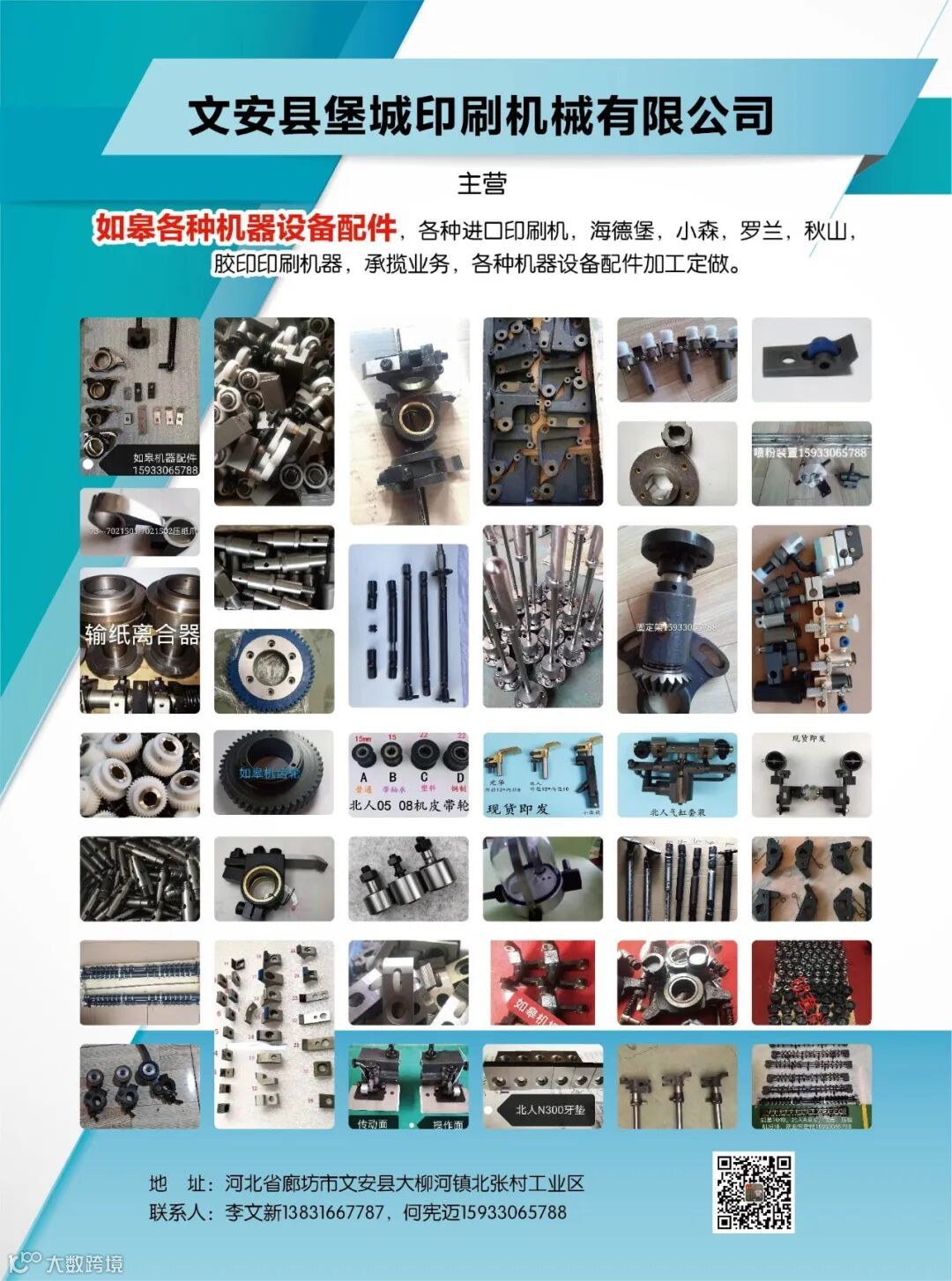 文安县堡城印刷机械有限公司主营如皋各种机器设备配件,各种进口印刷机、海德堡、小森、罗兰、秋山、胶印印刷机器,承揽业务,各种机器设备配件加工定做。