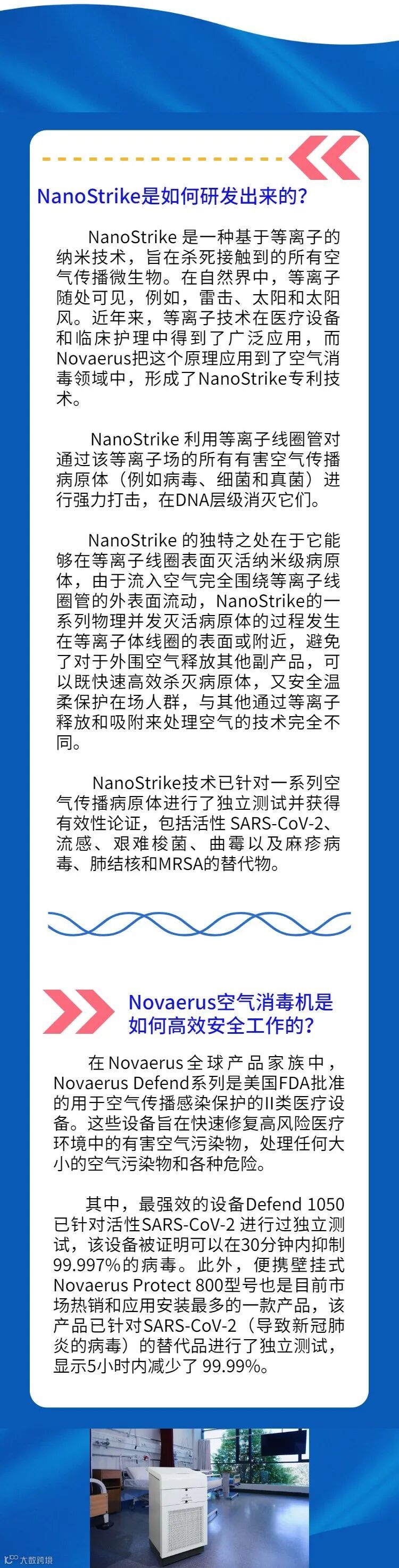 “NanoStrike也是Novaerus目前全球首发新产品 “Defend 400 ”的核心技术,Defend 400是FDA批准的 II 类医疗器械,可灭活雾化病毒、细菌和真菌,并净化空气中的颗粒物、挥发性有机化合物、气体和气味Novaerus Defend 400也将很快正式登陆中国市场!”