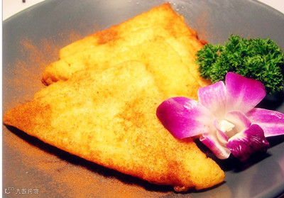 3、取锅,倒入约半锅份量的油烧热至约120℃后,再将作法2的吐司放入锅中炸至表面呈金黄色后,捞起沥油。