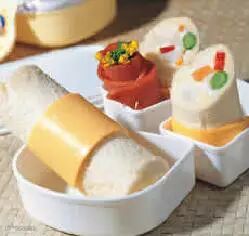4.取一片白吐司,铺上作法3中的内馅,再依照卷寿司的方式将土司卷起,最后将起士片围在土司卷的中央做为腰带即可。