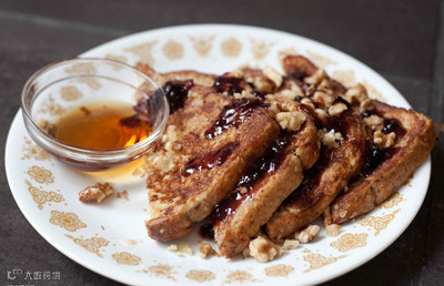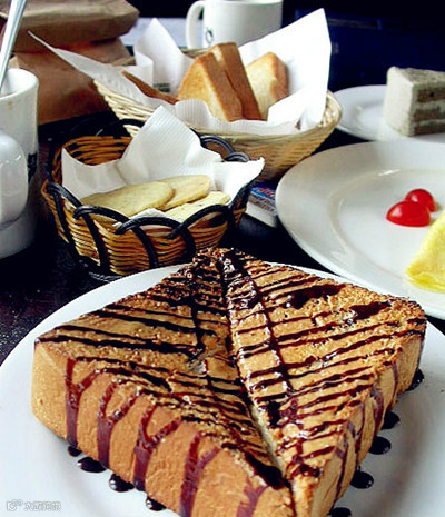 4、将煎好的法式吐司放入盘中,先淋上巧克力酱,再淋上奶精,最后撒上碎巧克力即可。