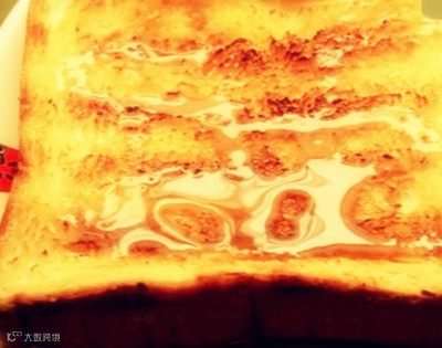 2、将作法1的吐司表面均匀抹上奶油后,再撒上粗砂糖后,放入烤箱以各200℃的上下火续烤约4分钟至吐司呈金黄酥脆即可。