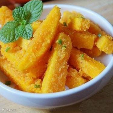 4、蛋黄炒碎后,把滤好水的南瓜条倒进翻炒,使南瓜条均匀蘸满咸蛋黄;