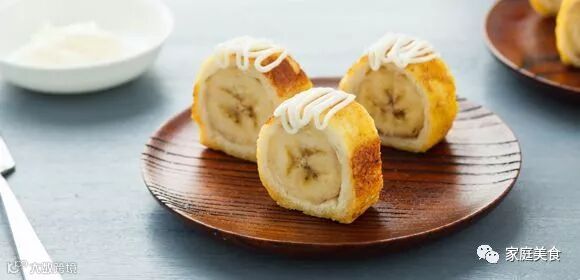 2、把吐司放在寿司帘上,再把香蕉放在吐司上,利用寿司帘把香蕉卷在吐司里,然后卷紧,这样就可以了。
