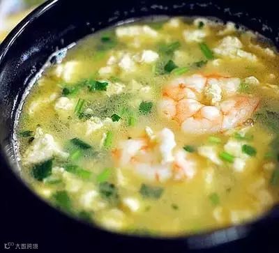 3、锅中加入适量清水,大火煮沸后放入虾仁煮10分钟,倒入蛋液、加葱末、姜末、盐和香油调味即可。
