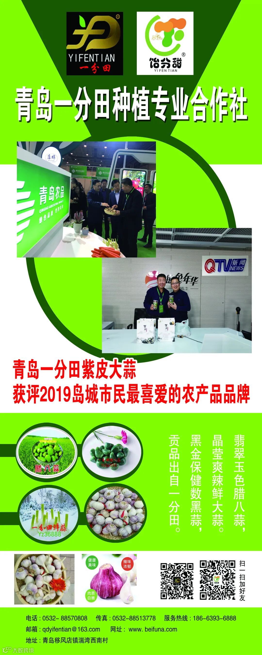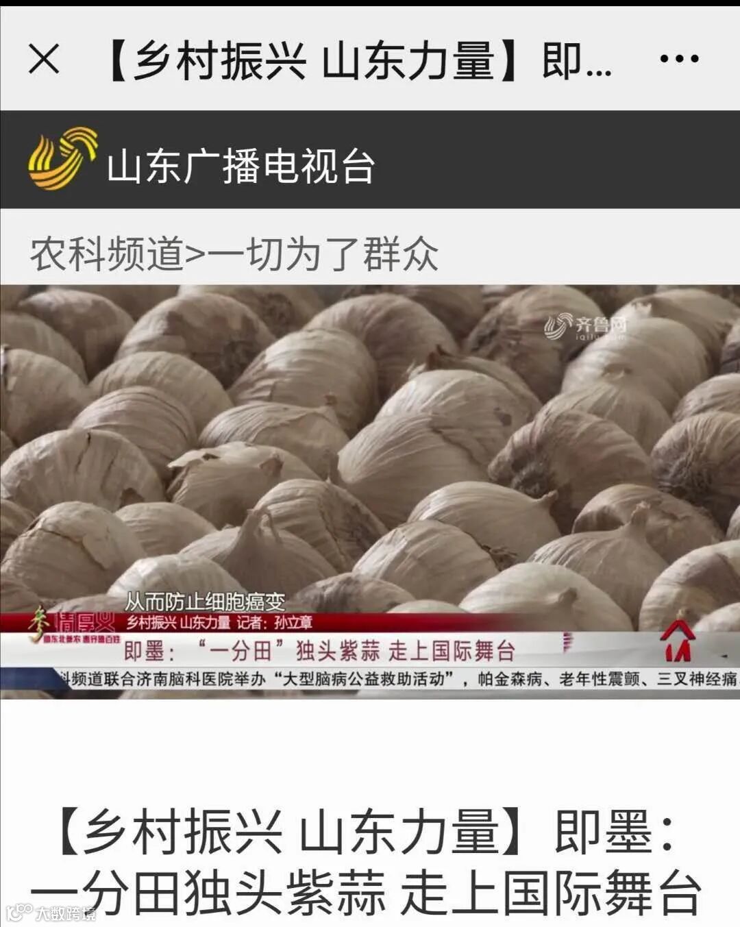 青岛一分田紫皮大蒜荣获“2019年岛城市民最喜爱的农产品”称号,青岛一分田农业科技有限公司生产的黑蒜以优异的品质被山东电视台农科频道栏目组报道。