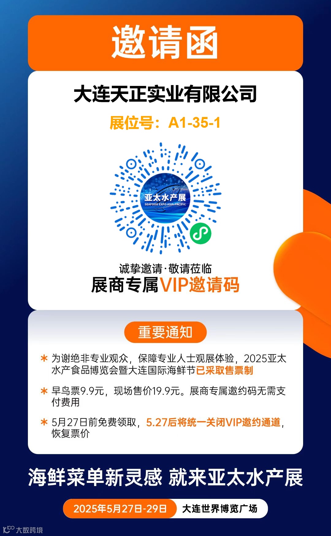 2025年5月27日-29日,天正欢迎大家莅临大连亚太水产食品博览会,相聚天正实业展位A1-35-1。