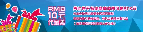 現場免費派發的門票及宣傳單張上附有10元代金券,凡單筆消費購物滿100元可使用10元代金券,詳情請參閱代金券細則。