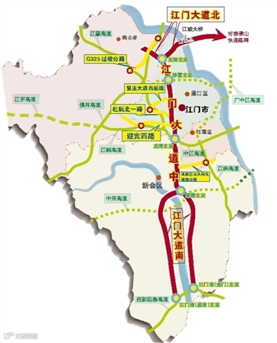 作为“火车头”,江门大道串联起了蓬江区、江海区、新会区和鹤山市三区一市,自北向南呈双“Y”型布局,东北方向通过江顺大桥连接佛山的快速路网,对接顺德;西北方向通过鹤山的325国道,快速对接江肇高速,联系高明、南海等地;东南方向延伸至新会区,对接珠海;西南方向接西部沿海高速的崖门出口,通至大广海湾……