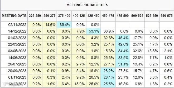 近期数据表现回落,加强美国经济在加息背景下走弱的观点,市场预期美联储将开始放缓加息步伐。根据“美联储观察工具”,市场对于美联储下周货币政策会议上加息75个基点的预期回落,目前为85.4%;到12月累计加息150个基点的预期迅速下滑至38.9%,累计加息125个基点的概率为53.1%。