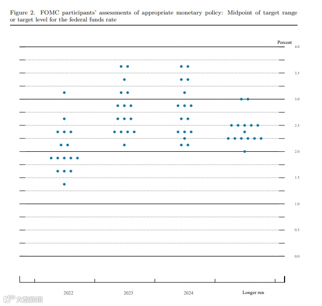 最新的点阵图公布(如下图)。对比去年12月公布的点阵图,美联储官员上调2022年联邦利率中位目标将达到1.9%左右,而去年12月的公布中显示中位目标在0.9%;2023年中位目标在2.8%。