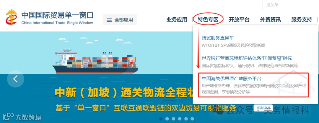 打开“单一窗口”标准版门户网站www.singlewindow.cn 点击 “特色专区”页签,进入中国海关优惠原产地服务平台。