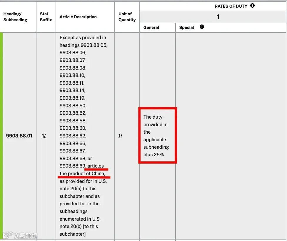 第99章(Chapter 99)被称为“临时立法修改章”(Temporary Modifications to the Harmonized Tariff Schedule)。美国加征的关税通常不在协调关税表的“general”栏直接显示,而是通过单独章节(第99章)或附加代码标注。