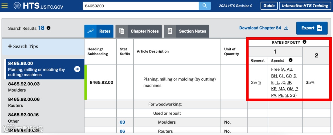 打开网站,输入产品对应的HTS编码或产品英文名称。我们以HTS编码 8465.92.00(加工木材等材料的刨,铣,切削机器)这一产品为例查询: