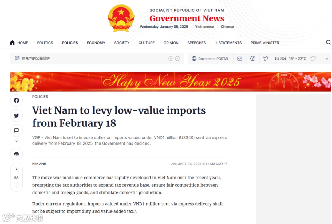近日,越南政府发布重要政策调整,宣布自2025年2月18日起取消对快递进口小额商品的增值税免征政策,同时废止2010年的相关规定。