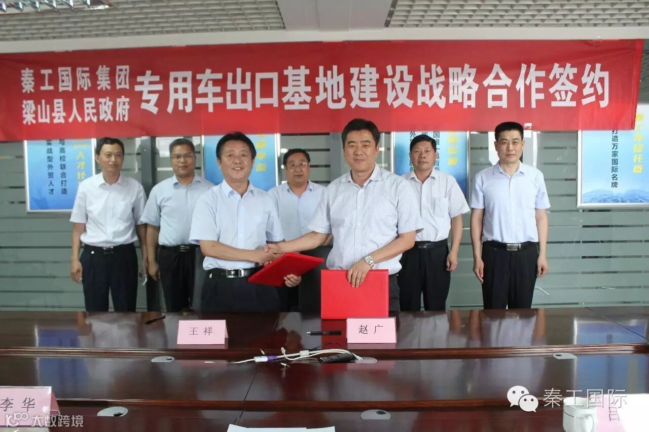 7月7日,秦工国际集团与梁山县人民政府专用车出口基地建设战略合作框架协议签约仪式在秦工结谊厅举行,秦工国际集团总经理王祥与梁山县副县长赵广分别代表双方签约。