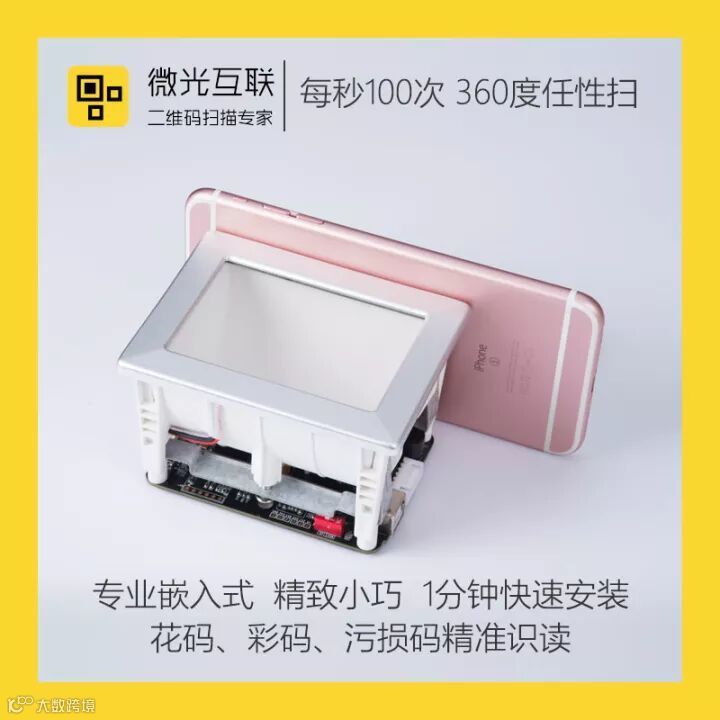 微光互联嵌入式二维码扫描器C100,采用铝合金面盖,钢化玻璃结实耐用,防戳防破损,具有70mm*50mm的超大识读窗,无论是大屏幕手机还是小屏幕手机都可快速准确识读,而且扫描引擎经过再次升级,即使扫描再暗的手机屏幕也毫无压力,带有扫码蜂鸣提示,为乘客提供丰富的互动扫码体验。