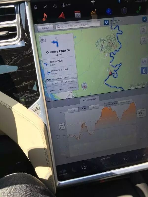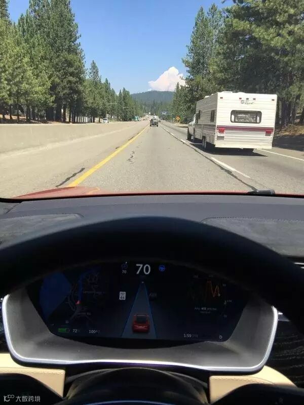 这次开着基础版60 kWh的Model S从湾区到Reno来回全程650 mi,也就是1050km,整个旅途基本如预想差不多,驾驶两个半小时中途吃个午饭一边充电,然后继续开,几乎没有特别感觉到跟开汽油车在时间上区别,这也印证了我之前对于里程和超级充电站的决断,话说自动辅助驾驶在公路旅行时极大的解放了驾驶员是我最大的体会,绝大部分路段都可以放心交给汽车自动辅助驾驶去完成,甚至包括这种弯道的时候: