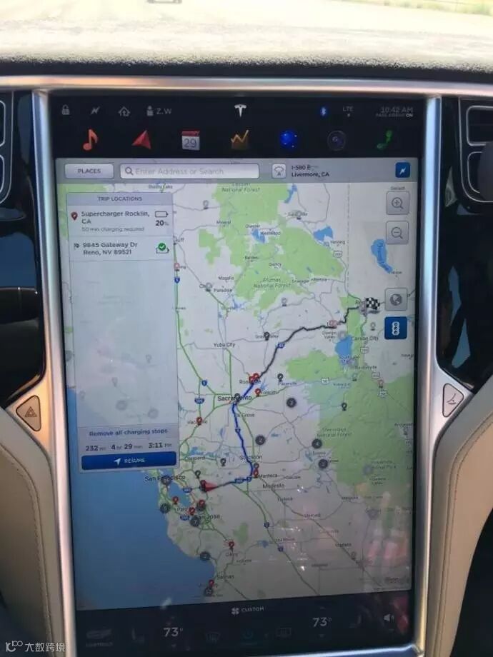 从湾区出发,到内华达的Reno有450公里,作为基础版本的60kWh,设计里程是340公里,所以中途必然需要充电,从湾区到Reno沿途有近10个超级充电站,我选择了中途的Roklin作为中继站,使用Model S的导航,显示到达时会剩余20%电量(其实这个估算十分保守,实际到达后还剩余40%电量):