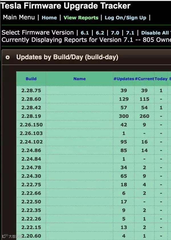 这个截图只是展示了一部分目前已经发布的Tesla Model S/X 7.1版本的软件更新版本号,详细列表请参考这个Tesla爱好者建立的追踪Tesla软件更新的网站:Tesla Firmware Upgrade Tracker。