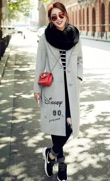 经典韩式搭配,修身的条纹上衣搭配紧身破洞裤,休闲时尚,外出随便披上一件呢大衣,背后大大的卡通图案,生动吸睛,随意又有范~