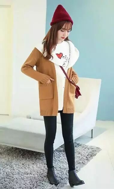 厚实温暖的毛衣外套,独特的拼接帽领样式,更加凸显层次感,大大口袋点缀,可爱洋气,内搭圆领套头毛衣,下着小脚裤,青春显瘦。