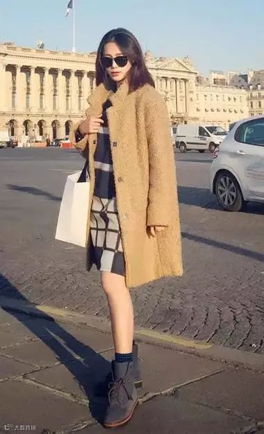 经典的驼色大衣,版型很好,大气有范!搭配条纹连衣裙,修身显瘦,出街美美的!