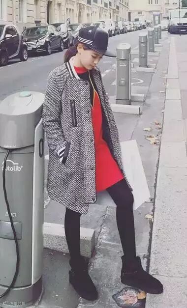 棒球服式呢大衣,很特别的设计,有创意,上身效果很好,搭配撞色打底裙,休闲不失大气风范儿!