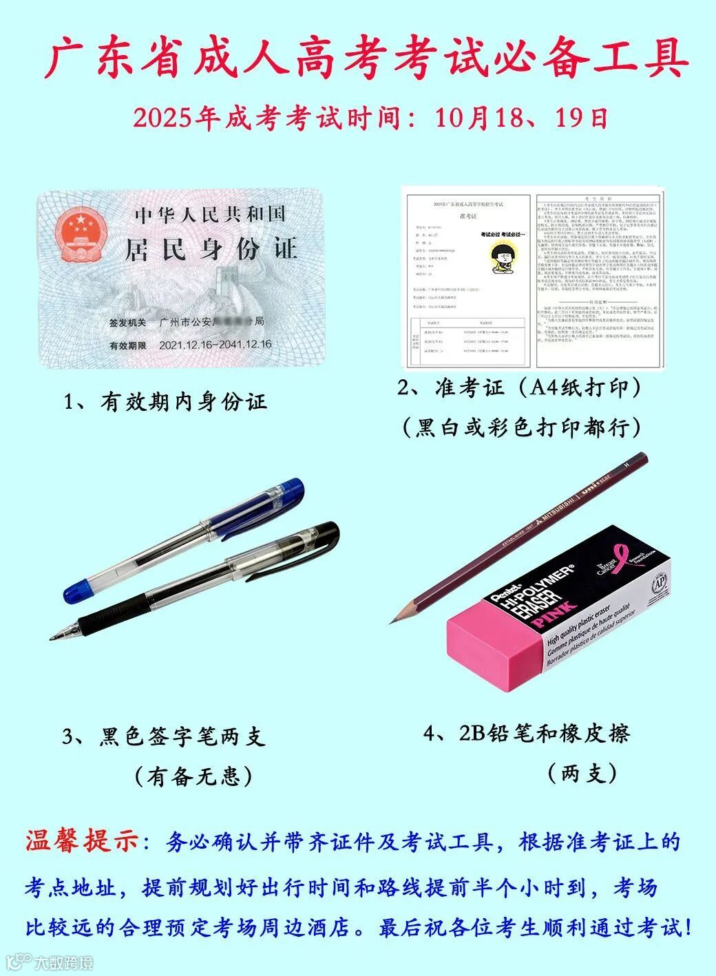 成人高考准考证及二代身份证原件是考生顺利参加成人高考的准要凭证,请务必提前准备。