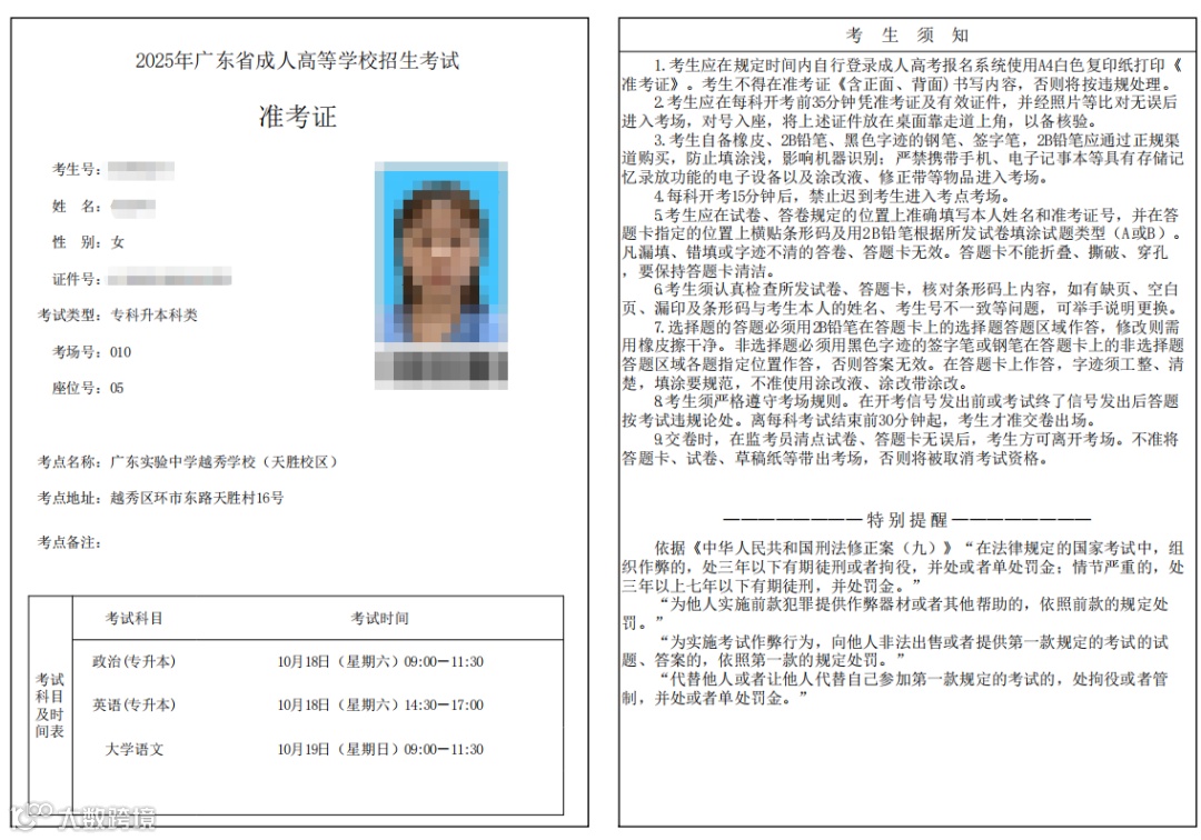 2025年广东成人高考准考证打印官网: