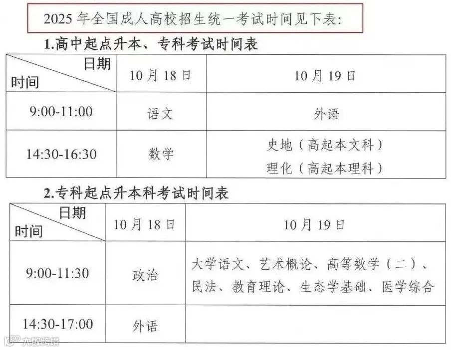 ③ 考试科目安排及考试时间表:此处一般是考生所报考层次各科目的考试时间。其中高起专、专升本的考生是参加3个科目的考试,而高中起点升本科的考生则须参加4个科目的考试。